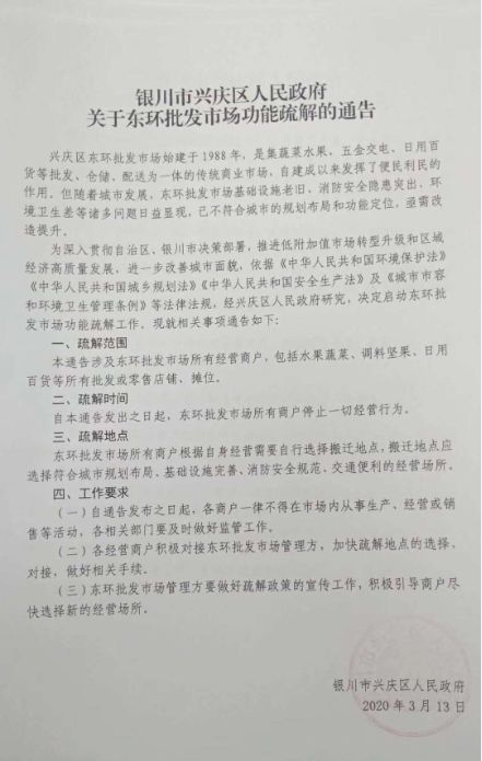 新聞中心3月13日,興慶區(qū)人民政府正式發(fā)布了《銀川市興慶區(qū)人民政府關(guān)于東環(huán)批發(fā)市場(chǎng)功能疏解的通告》。通告肯定東環(huán)市場(chǎng)的歷史功用,同時(shí)指出現(xiàn)階段,東環(huán)市場(chǎng)已經(jīng)不能滿足城市規(guī)劃布局及功能定位的發(fā)展需要,并就東環(huán)市場(chǎng)的的功能疏解事宜給出了具體指導(dǎo)及工作要求,東環(huán)動(dòng)遷已成定局。