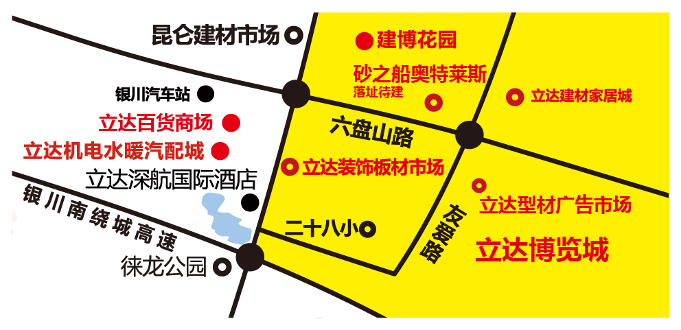 立達(dá)博覽城68#地,南至規(guī)劃路,北至六盤(pán)山路,東至燕慶路,西接交通物流要道友愛(ài)路,暢通四方,收發(fā)貨方便,高效配送全國(guó),同時(shí)市場(chǎng)內(nèi)自配物流,立達(dá)型材廣告市場(chǎng)百米內(nèi)配套大型物流園,百條線路暢達(dá)全國(guó),有效降低商戶運(yùn)輸成本,提高配送效率,物流高效便捷。