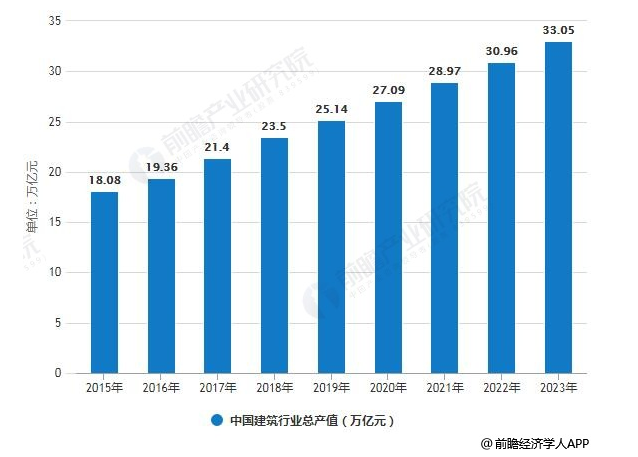 新聞中心預(yù)測2019年中國建筑行業(yè)總產(chǎn)值將突破25萬億 ,據(jù)前瞻產(chǎn)業(yè)研究院發(fā)布的《中國智能建筑行業(yè)發(fā)展前景與投資戰(zhàn)略規(guī)劃分析報(bào)告》統(tǒng)計(jì)數(shù)據(jù)顯示,2015年中國建筑業(yè)總產(chǎn)值為18.08萬億元,同比僅增長2.3%。2016年中國建筑業(yè)總產(chǎn)值達(dá)到19.36萬億元,同比增長7.08%。到了2017年,全國建筑業(yè)總產(chǎn)值為213954億元,同比增長10.5%。截止至2018年中國建筑業(yè)總產(chǎn)值達(dá)23.5萬億元,同比增長9.9%。預(yù)測2019年中國建筑行業(yè)總產(chǎn)值將突破25萬億元,未來五年(2019-2023)年均復(fù)合增長率約為7.08%,并預(yù)測在2023年中國建筑行業(yè)總產(chǎn)值將達(dá)到33.05萬億元左右。